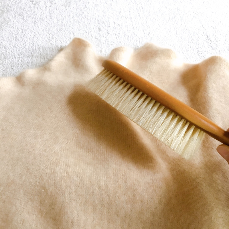こんな日にはお気に入りのカシミヤセーターで!とこの秋初めて袖を通して朝の散歩に出かけました。顔には朝の冷たい空気があたり、けれど体はポカポカと暖かい。「やっぱりカシミヤはいいなぁ。」と気分が上がりました。残念なことに犬が散歩中に公園のグランドで寝転がり、砂ぼこりまみれに。家に戻ると直ぐに風呂場で汚れを落とすことになりました。せっかくのセーターが汚れてしまわぬように脱いでハンガーにかける。セーターにサクッと洋福ブラシをかけて砂ぼこりを落とします。このひと手間、面倒臭いと感じるかもしれませんが、自分にとっては好きなモノを丁寧に扱う時間そのものが心地よいのです。これからの乾燥する冬に役立つのが洋服ブラシです。