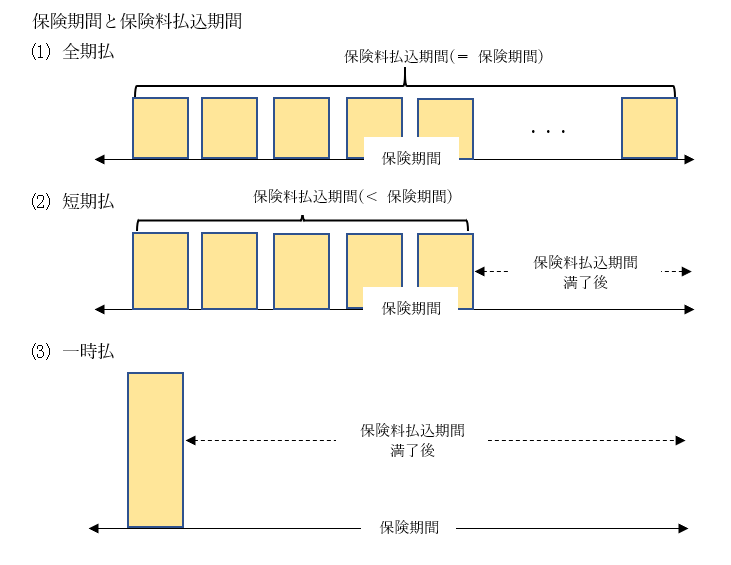 ここでは、保険料の払込期間がポイントとなります。具体的には、保険期間に渡って払い込むもの(全期払)と、保険期間より短い期間、例えば10年間など(短期払)、契約時に一括で払い込むもの(一時払)に分けられます。