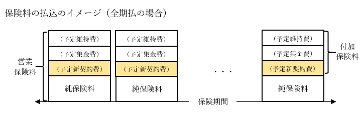 実は、この契約時にまとまった金額が支払われるというのがポイントです。下図のとおり、付加保険料の一部である予定新契約費は、保険期間にわたり平準的に払い込まれます。