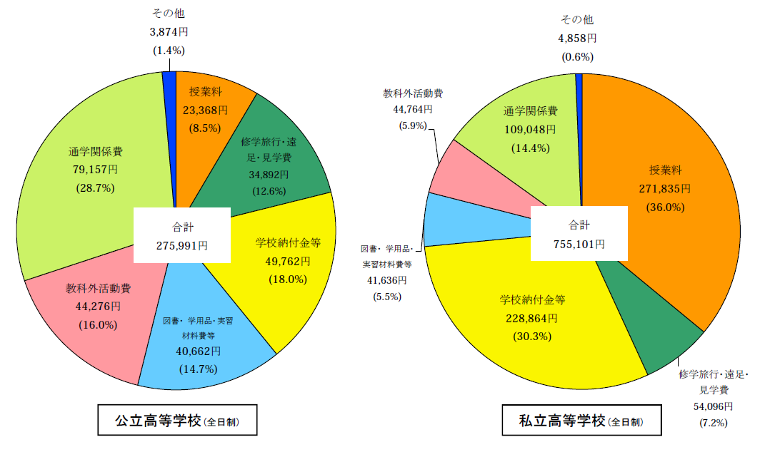 このように、公立高等学校(全日制)は各項目に対して大きな偏りなく支出されているのに対し、私立高等学校では授業料と学校納付金等(入学金、入学検定料、施設整備資金、学級費、PTA 会費、寄附金など)の占める割合が多いことが分かります。