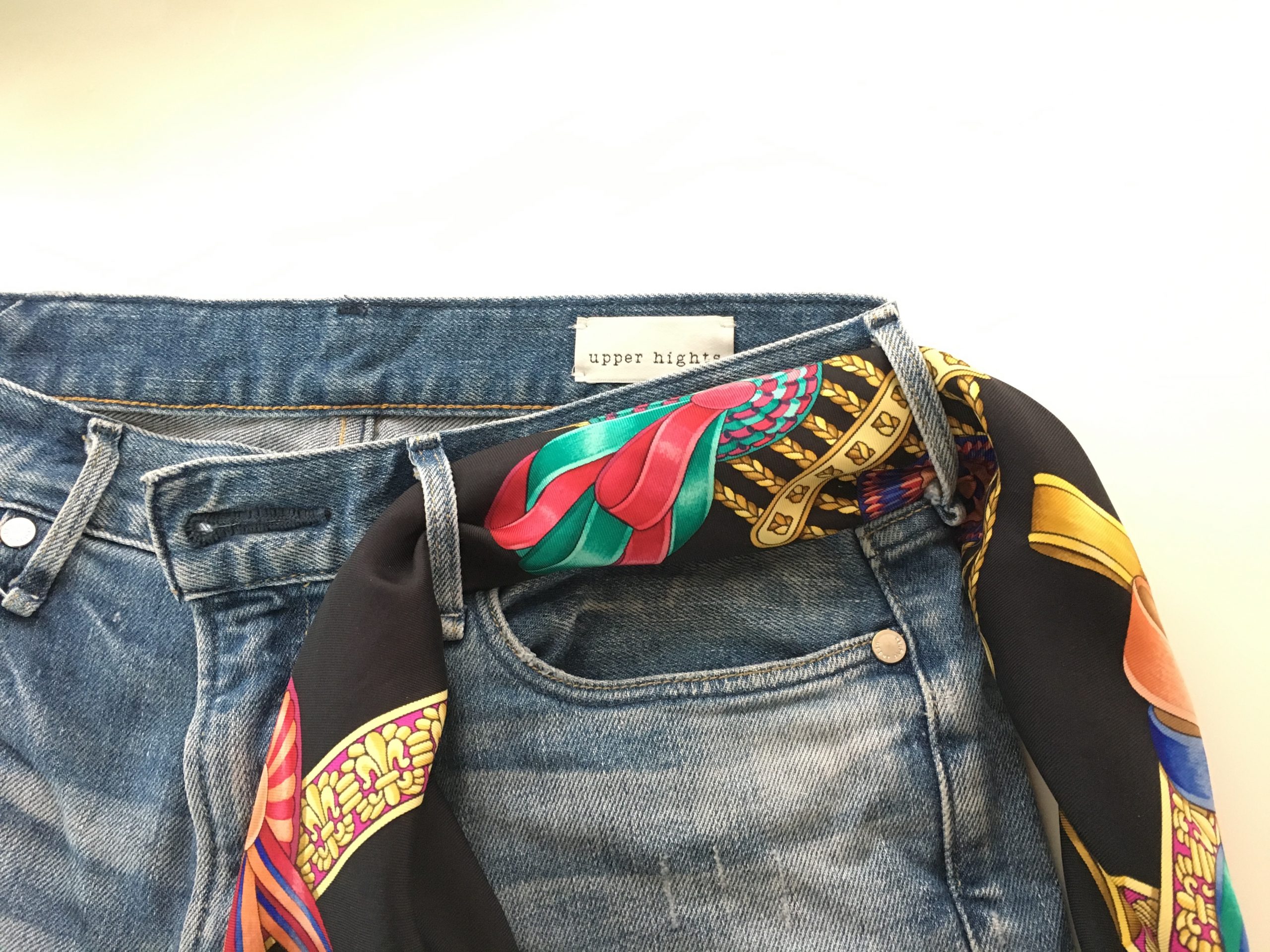 素材がシルクのスカーフ。旅先で肌寒さを感じたらちょっと首に巻いたり、肩にかけると冷えから体を守ってくれます。そして、普段のデニムのベルトに通して、チラッと見せるオシャレを楽しんだりします。荷物が増えたらエコバックが欲しいですよね。スカーフの四隅を尻尾のように長めに出して各々一つ結び、隣同士の尻尾を小さく団子に結ぶと即席のバッグに変身。お土産や文庫本などちょっとしたものを入れて持ち運べます。これは風呂敷の応用から学んだものです。やはり、日本の文化は賢さが際立っているなと感心します。よく身に着けていたあの頃、アレンジなど知らず、いつも同じような巻き方しかしていなかったなと記憶しています。時が流れ、今の私にはスカーフは旅のお友として欠かせないアイテムになりました。