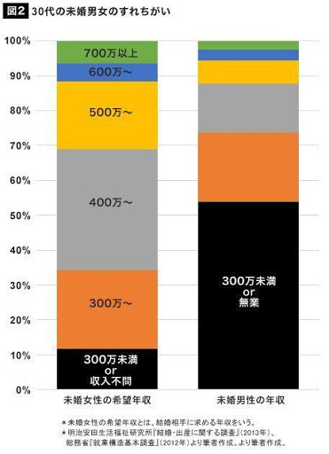 対象が30代という年代限定ではありますが、女性の希望する年収400万以上の未婚男性は全未婚男性の3割を切っています。