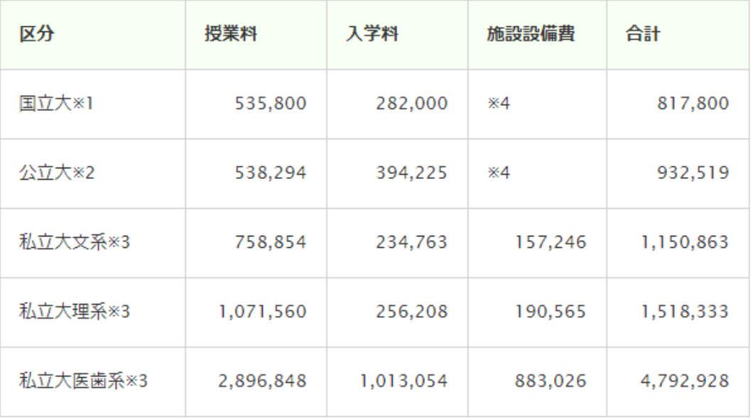 ここが最も差が開きます。医療系国立の場合、基本的に817,800円、公立も基本的に932,519円、私立の場合は4,792,928円になります。実に国立の約5.86倍です。