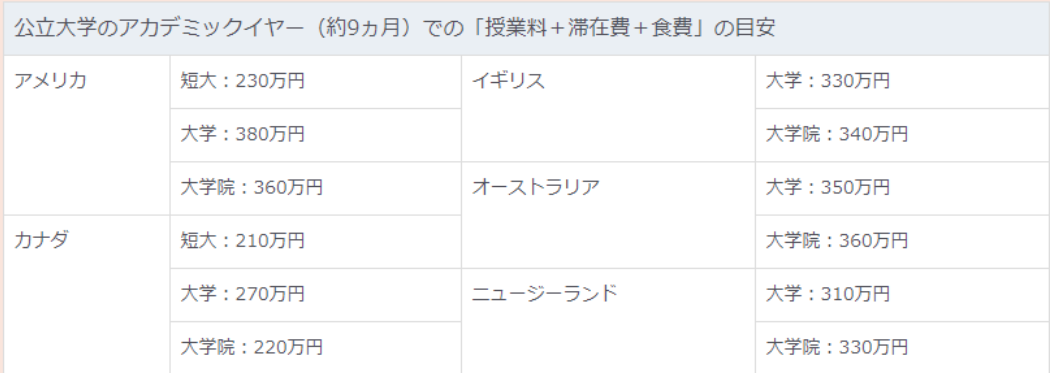 海外留学となると更に大きな支出になります。公立か私立か、2年制か4年制かで授業料は大幅に異なります。上図は公立大学に9か月留学した場合ですが、カナダが比較的安いと見受けられるものの、やはり200万を優に超えます。奨学金が利用できるかどうかで総額は大きく違ってきます。