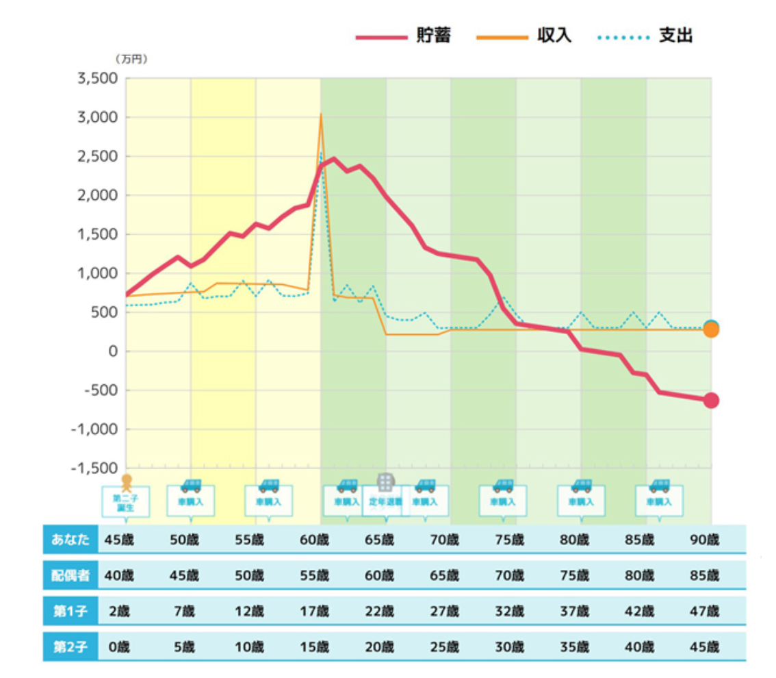 80歳で貯蓄額が底をつき、90歳の時点で500万円以上のマイナスとなっています。