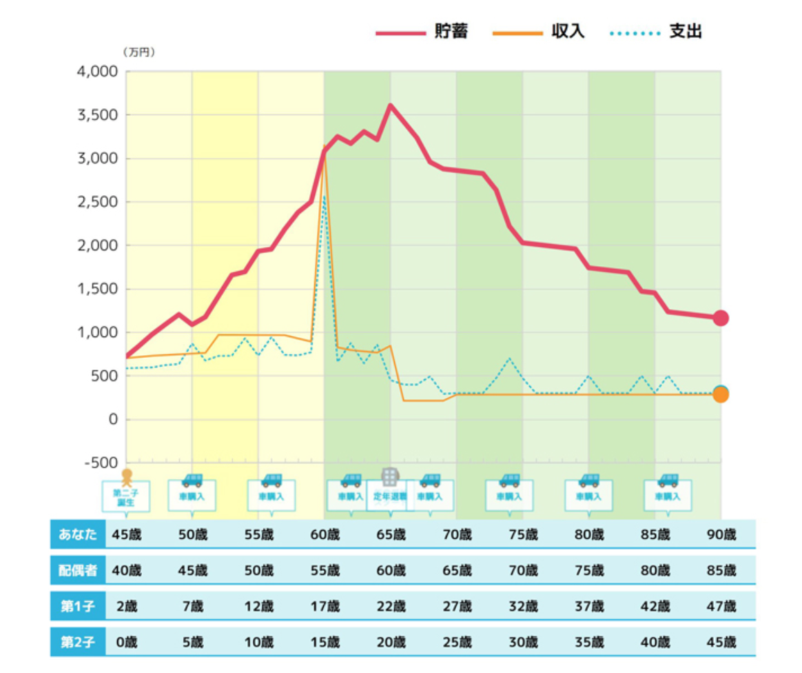 これだけで、生涯一度も赤字に転落することなく、90歳の時点で1,000万円以上の貯蓄額となりました。