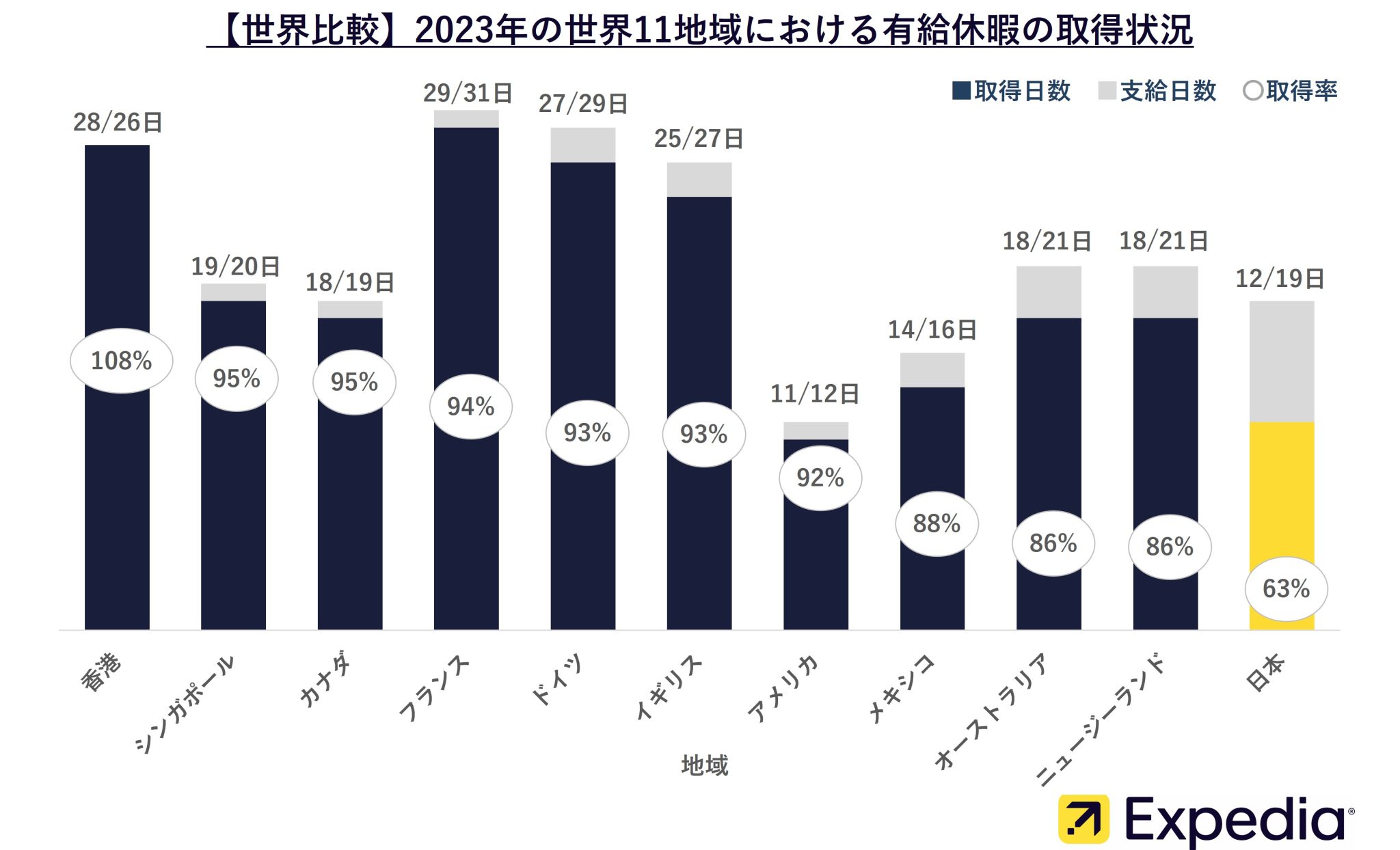 日本の有給休暇取得率は63%。なんと世界11地域の中で最下位となっているのです。