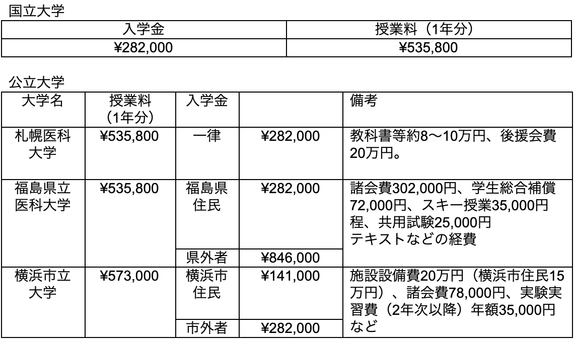 国立大学医学部の学費は、下図の通り、公立大学医学部とほぼ同額です(非住民の場合、公立大学の入学金はかなり高くなることも)。学費が更に安い防衛医科大学校という選択もありますが、それも含めても国公立医学部は国内に50しかありません。現在、これらの半数は、東大理Ⅰより偏差値が高くなっています。