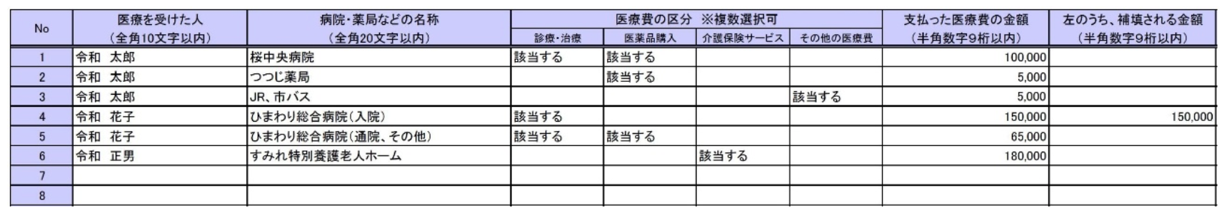 たとえば、令和太郎さんが前年の1年間に同じ病院に複数回通った場合、それらは合計して記載できます。ただし、同じ病院でも、妻の花子さんがかかった場合は、別に記載します。