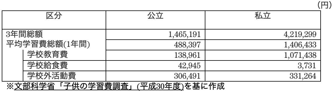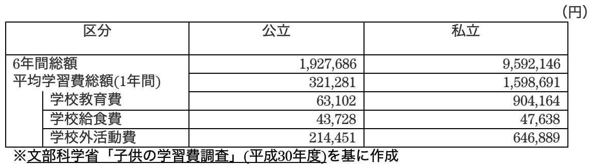 公立と私立では1年間に平均30万円の差があります。詳細は以下の表をご覧ください。