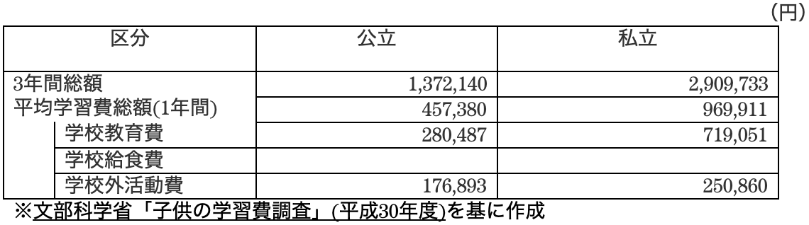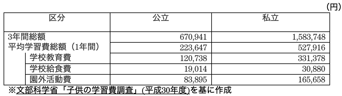中学校では学校教育費の差は大きいものの、学校外活動費はあまり変わらない結果となっています。勉強する時間が多くなり、高校受験のために塾や家庭教師の費用が大きくなってくることが理由と考えられます。