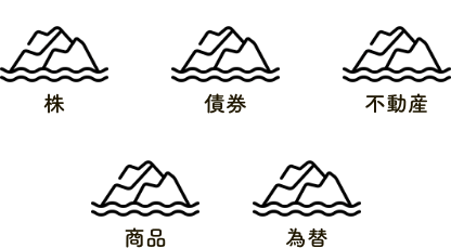 株とは異なり、基本的には元本保証があるため、5つの島すべて(世界経済)の天候が悪いときには、債券にお金が流れてくる傾向にあります。債券には国債のほかに、企業が発行する社債や、外国の企業が発行する外国債券などもあります。