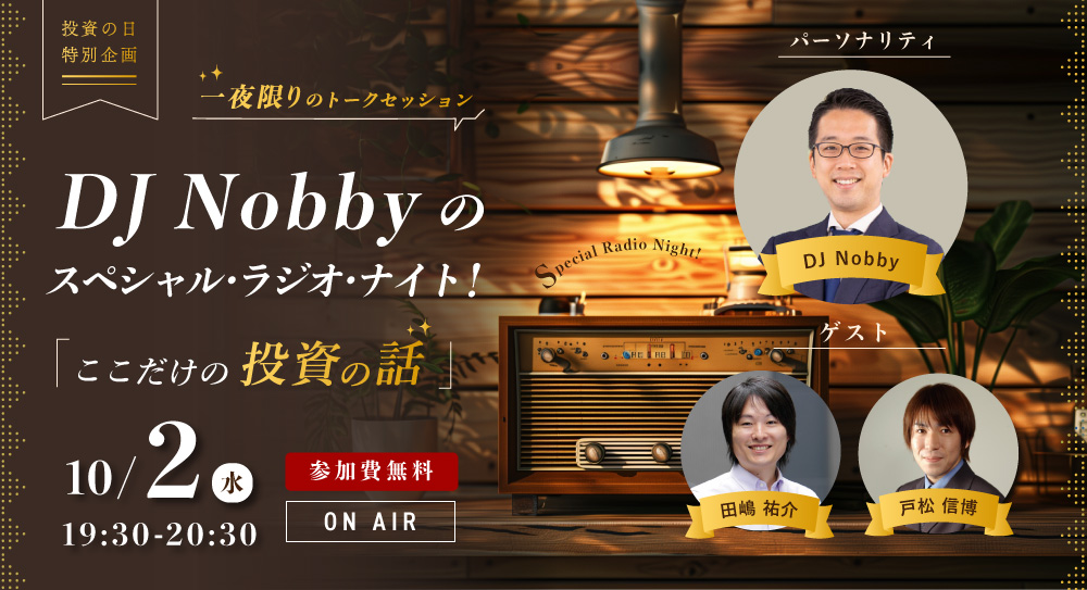そんなDJ Nobby氏が、「DJ Nobbyのスペシャル・ラジオ・ナイト!」と題して、一夜限りのトークセッション「ここだけの投資の話」をお届けします。