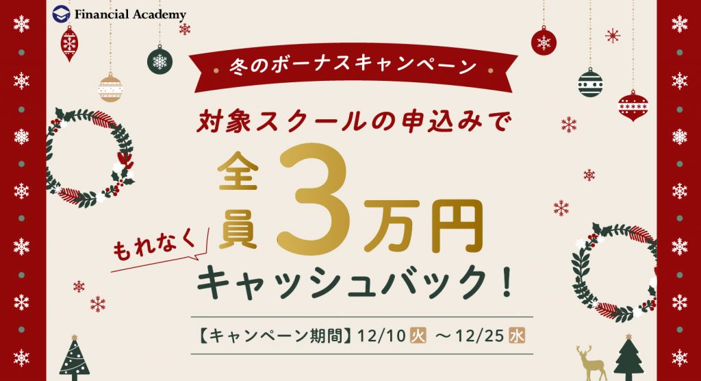 1年間、頑張った自分へのご褒美として、「何をしようかな?」「どこに出かけようかな?」と、心が弾むこの時期。そんなワクワクする気持ちをさらに盛り上げるために、ファイナンシャルアカデミーでは、未来への一歩を後押しする「冬のボーナスキャンペーン」を開催します。