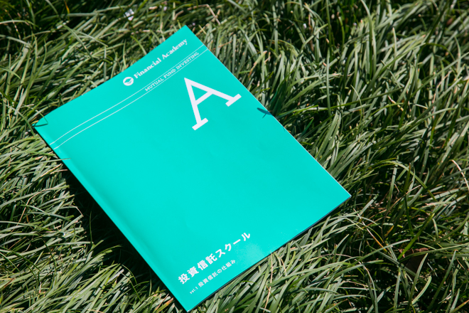 これは、新しくできた「投資信託スクール」の教科書なんです。新しいことが始まりそうな、ワクワクする色になりました!
