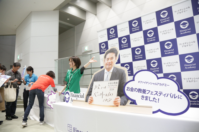 そして、休憩時間も来場者に楽しんでいただけるようにと、スタッフがアイデアを出し合いました!ホール両脇に特別ブースを設置し、たくさんの来場者をファイナンシャルアカデミースタッフが出迎えました。