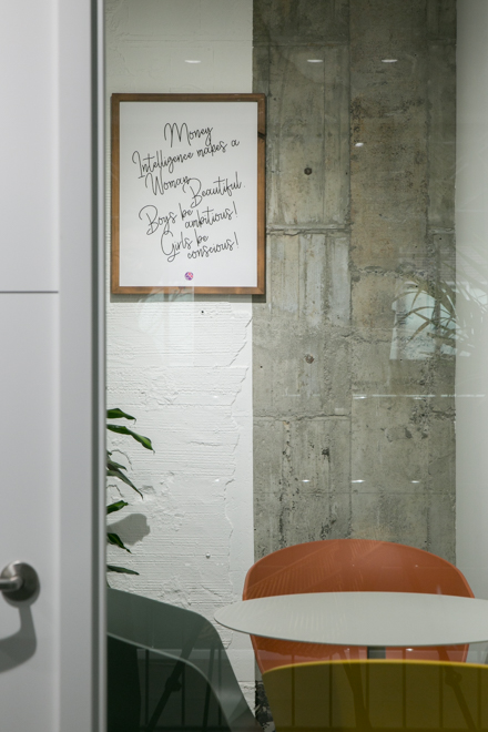MEETING ROOM2には、ファイナンシャルアカデミーグループのひとつ、FPwomanが女性に向けた言葉、「お金の知性が、女性を美しくする」が飾られています。