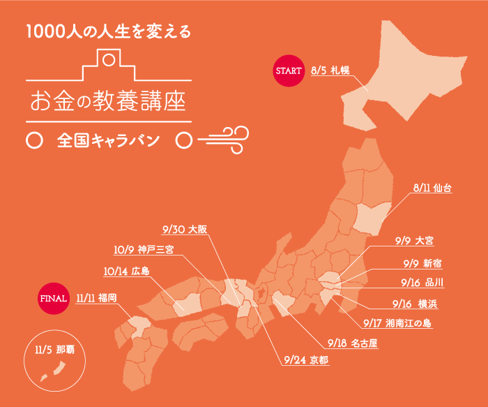 あなたの街に「お金の教養キャラバン」がやってくる!今年で創立15周年を迎えたファイナンシャルアカデミーでは、「ひとりでも多くの人にお金の知識を身につけてほしい」という想いから、1,000人の人生を変える「お金の教養講座 全国キャラバン」を開催します。 |