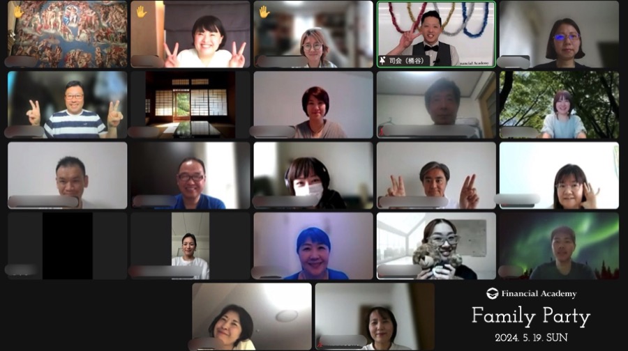 そんな、対面とはまた違ったよさを持つ、オンライン上での人との交流。ファイナンシャルアカデミーでもZoomを使ったオンライン授業やイベント配信に加え、スクール受講生限定の交流会「Family Party」をオンライン上で開催しています。