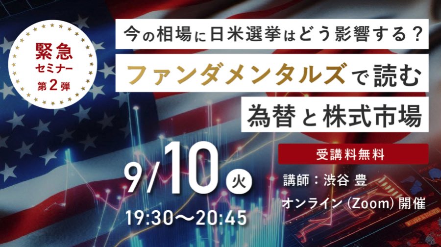 そこで、先日の大暴落の際に開催して参加者が1,000人を超えた「緊急セミナー」に続く「緊急セミナー第2弾」として、「選挙」にフォーカスを当てた緊急セミナー『今の相場に日米選挙はどう影響する?ファンダメンタルズで読む為替と株式市場』を開催します!