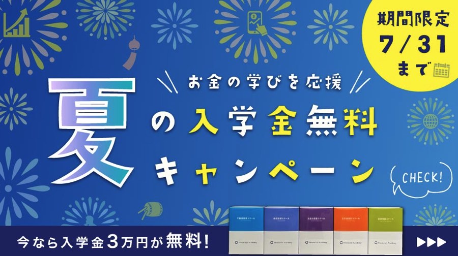 そこでこの夏、「時間の投資をしたい」というあなたを応援するために!7月31日までの期間限定で、ファイナンシャルアカデミーの5つのメインスクールで「入学金無料キャンペーン」を実施中です。