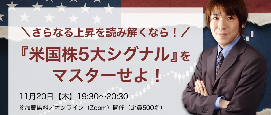 そこで米国株の今後を、初心者にもわかりやすく5つのシグナルで読み解く特別イベントを開催。その名も『さらなる上昇を読み解くなら!「米国株5大シグナル」をマスターせよ!』です。
