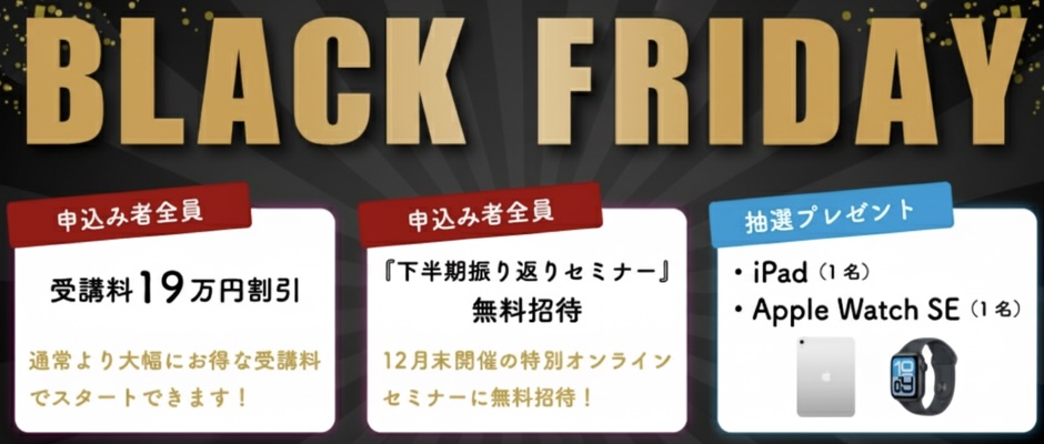 今年は、これまでで最も安く受講できる割引に加えて、過去最大級ともいえる豪華特典で「ブラックフライデーキャンペーン2025」を開催します。