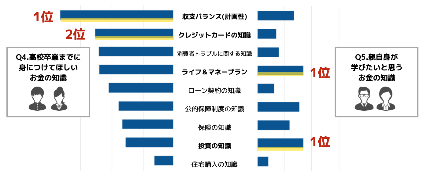 Q3に関連して、高校卒業までに子どもに身につけてほしい「お金の知識」について尋ねたところ、最も多かった意見が「収支バランス(お金を使うときの計画性)」、ついで「クレジットカードの基礎知識」となりました。また親自身が学びたいと感じる「お金の知識」については、「投資の知識」「ライフ&マネープラン」が同率1位となりました。子どもに対しては実生活でまず困らない知識をつけてほしいと願い、親自身はこれまで教わることのなかった「投資の知識」や、老後2000万円不足問題でも明らかになった「生涯必要なお金に関する知識」について知りたいと感じていることが読み取れます。