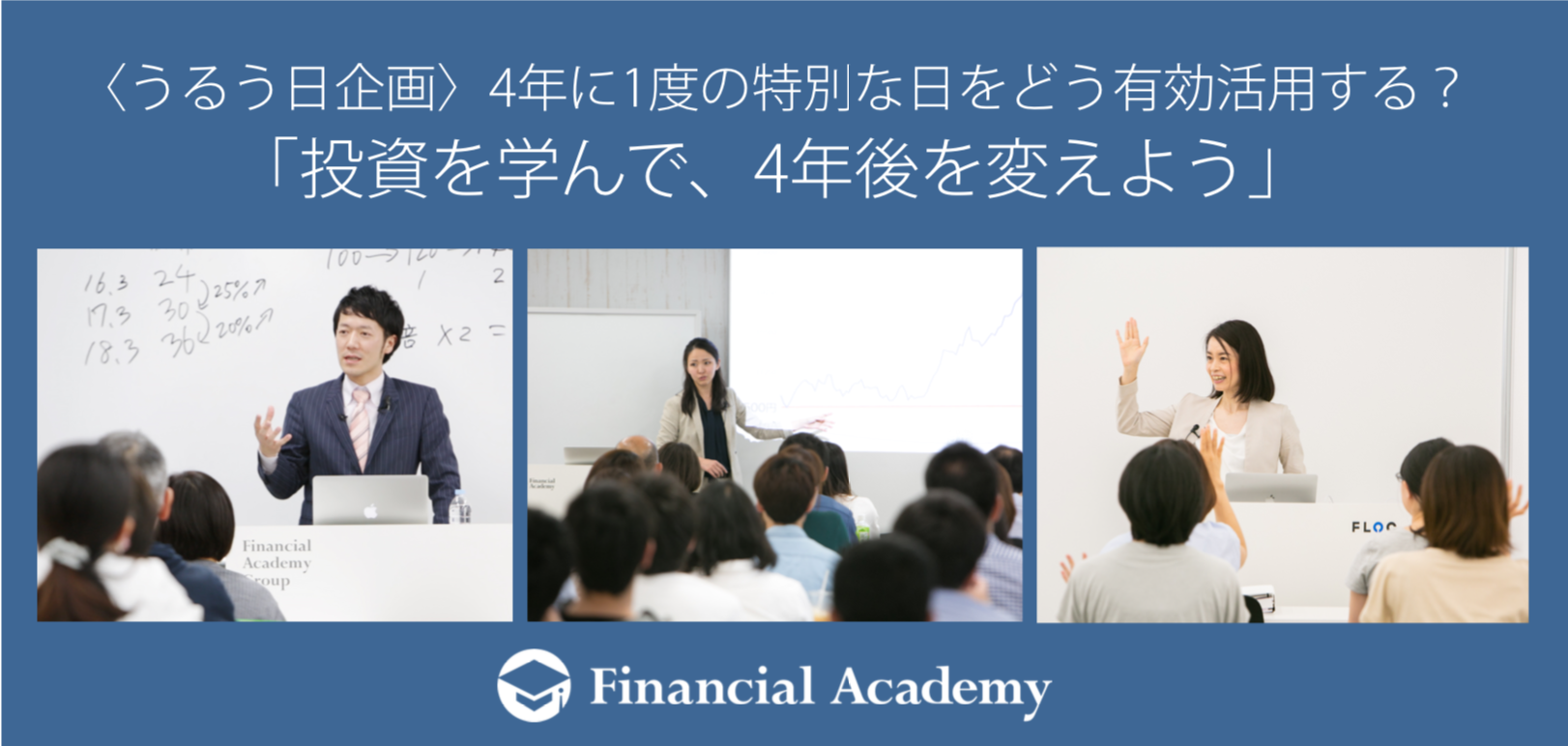 総合マネースクールであるファイナンシャルアカデミー(本社:東京都千代田区、代表:泉正人、以下当校)は、“うるう日”となる2月29日(土)に、4年に一度のプラスαの1日を投資を学び始める日にすることで未来を変えるきっかけにしてほしい、という想いから、投資初心者向けの無料講座を全9講座、有料スクールとあわせると全22講座を開催します。これは、通常の2倍以上の開催数となり、東京および大阪で実施します。