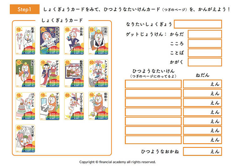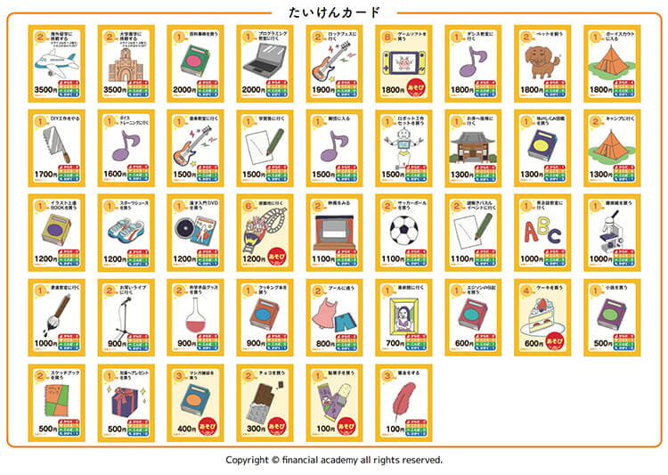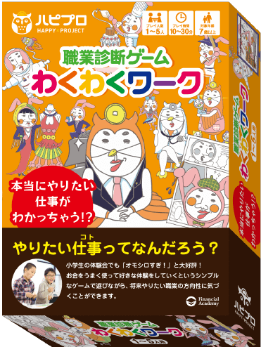 お金を上手に使いながら、興味のある体験を重ね、憧れの職業を目指すというカードゲームです。 小学生向け体験会では「オモシロすぎ!」といつも大好評。 仲間との楽しいやり取りを通して、一人ひとりが、将来やりたい職業の方向性に気づけるので、 小学生はもちろん、キャリアを考えるすべての人におすすめです。