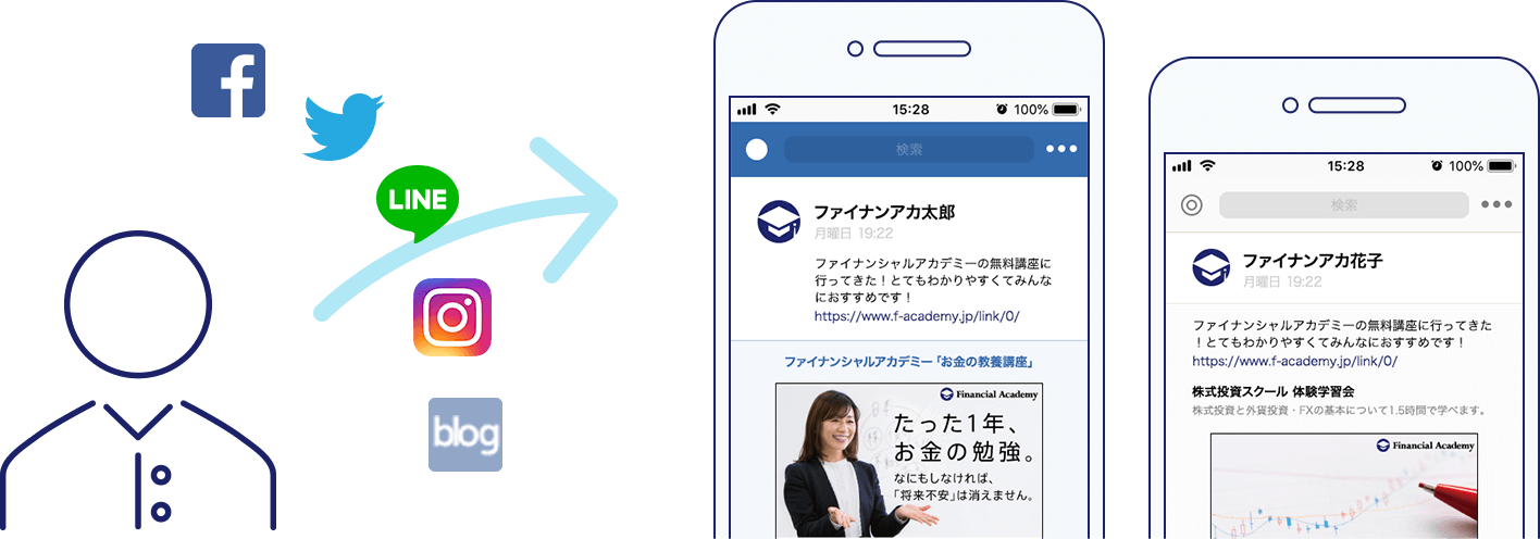 紹介用の専用URLを利用して、SNSやブログ、ホームページでファイナンシャルアカデミーのスクールや講座を紹介してください。ファイナンシャルアカデミーには40を超える豊富な講座があります。多数の講座からお好きな講座を選択できます。