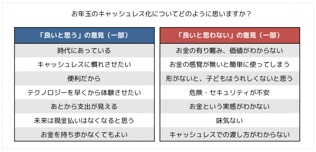 前問の回答理由をたずねたところ、キャッシュレスでのお年玉肯定派は「時代にあっていると思うから」「キャッシュレスに慣れさせるため」などの意見があがりました。自身の日常の決済方法がキャッシュレス化するに連れ、キャッシュレスでのお年玉にも興味や必要性を感じているようです。一方で、反対派の意見は「お金の有り難み、価値がわからない」といった不安の声が圧倒的多数となりました。