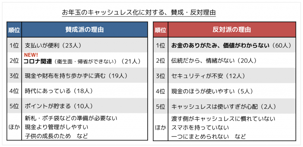 前問の回答理由をたずねたところ、キャッシュレスでのお年玉賛成派は、昨年までの 「支払いが便利」という声に加え、今年は新たに、新型コロナウイルスに関連した「非接触なので感染リスクを軽減できる」「帰省自粛で会えなくても贈ることができる」といった声も聞かれました。一方、反対派は「お金のありがたみ、価値がわからない」という意見が、圧倒的多数となりました。