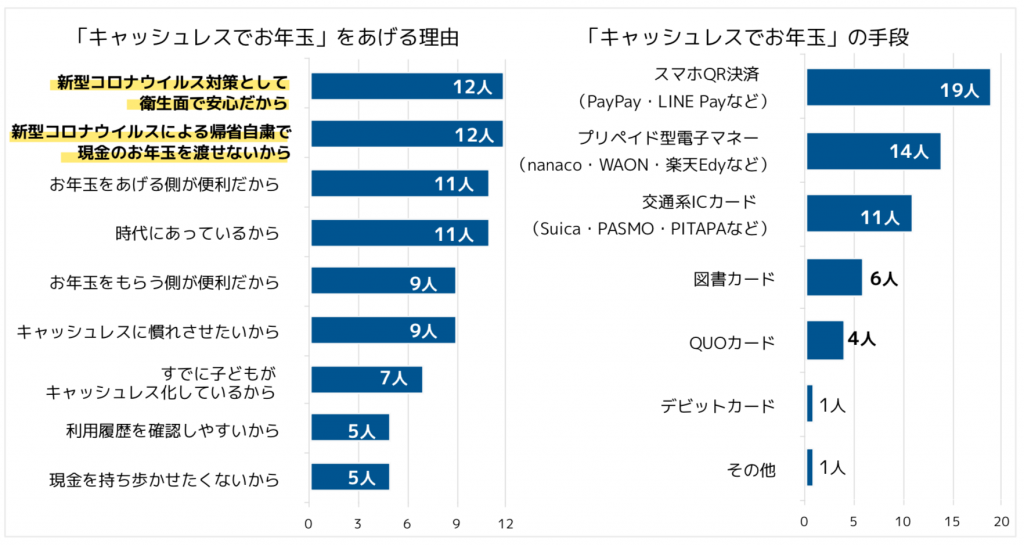 前問で「お年玉をキャッシュレスあげる」と回答した人にその理由をたずねたところ、「新型コロナウイルス対策として衛生面で安心だから」「帰省自粛で現金のお年玉を渡せないから」といった今年ゆえの理由が同率で首位となりました。なお、キャッシュレス手段としては「◯◯Payなどのスマホ決済」「nanacoなどのプリペイド型電子マネー」「Suicaなどの交通系ICカード」が上位にあがりました。