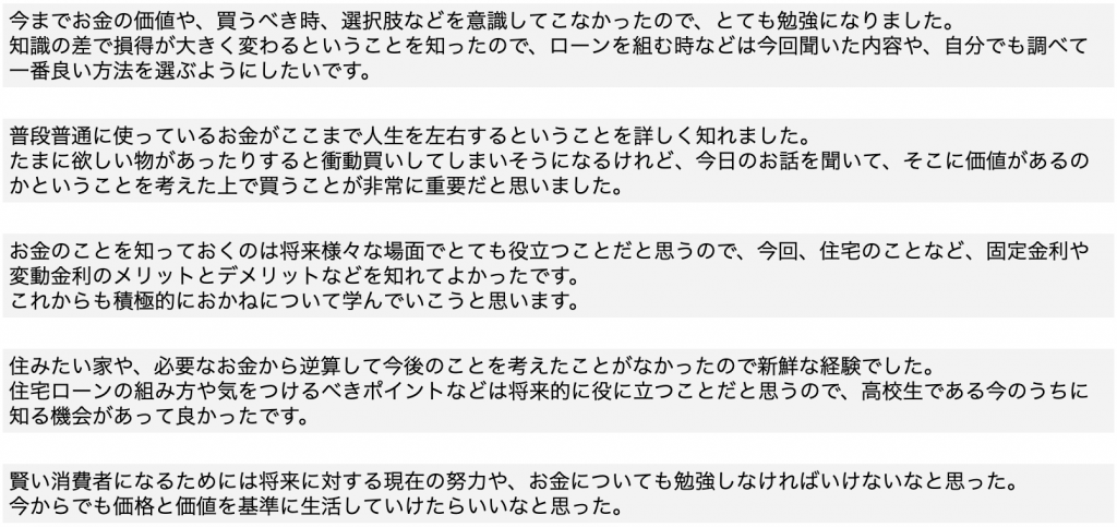 今から7年前、特別授業として高校2年生に対して放課後にお金の教養講座を開催し、生徒からも先生方からも素晴らしい授業だった!と言って頂いたことから、その翌年から家庭科の本授業として毎年行っている授業です。
