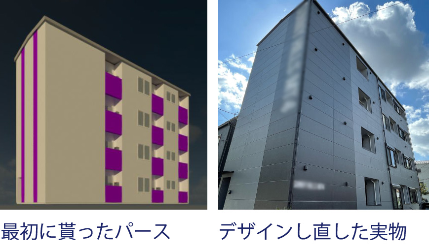 不動産投資は「運用に直接関与できる」というところも、大きな魅力だと感じています。例えば株式投資だと、株価は自分の意志でコントロールできるものではありませんよね。でも不動産投資は、自分次第で物件の価値を上げることができるんです。例えば、練馬区に建てたこのマンション(写真右)は、土地を買って自分でマンションをデザインしたんですが、ありがたいことにすぐに満室にすることができました。私は本業がマーケティングとブランディングなのでその知見を活かして、周辺のマンションをリサーチし、他にはないスタイリッシュなデザインのマンションを作ったんです。ちなみにデザイナーさんから最初に貰ったパースが写真左です。本音を言うと、あまりスタイリッシュさを感じなかったので(笑)写真右のように自分でデザインし直したわけです。こういう工夫をできるところが、経営に似ていて面白いと感じています。